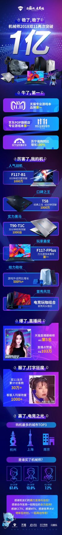 李佳輝 · 2018-11-13 09:00 - 國產(chǎn)品牌的驕傲 機械師2018雙十一銷售額再破1億