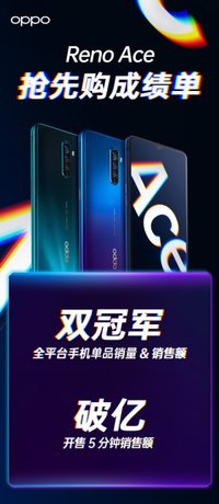 10月18日,OPPO廣東移動(dòng)通信有限公司(以下簡(jiǎn)稱:OPPO)再一次傳來(lái)戰(zhàn)報(bào),OPPO Reno Ace 在17號(hào)搶先購(gòu)當(dāng)天,斬獲全平臺(tái)手機(jī)單品銷量&銷售額雙冠軍,開(kāi)售5分鐘銷售額破億 !