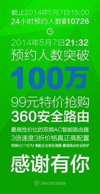 尚玉婷 · 2014-05-09 07:47 - 360安全路由預(yù)約超100萬 99元預(yù)定最后一天