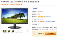 ????泡泡網(wǎng)液晶顯示器頻道1月18日? ● 產(chǎn)品型號:三星 EX1920W ● 產(chǎn)品現(xiàn)價:788元 ● 編輯點評:三星19吋LED背光液晶,16:10寬高比,產(chǎn)品具有靈巧模式, 靈惠節(jié)能, 靈動視角, 靈妙雙屏,定時開關(guān), 寬普兼容顏色效果,自定義按鍵, 支持Windows7等等。 ● 優(yōu)點:LED背光、16:10寬高比、便宜 ● 缺點:質(zhì)保僅一年