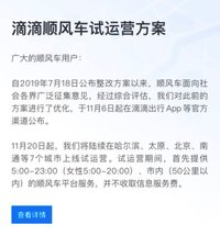 NJ-張嬌 · 2019-11-06 15:52 - 滴滴順風(fēng)車回歸:7城開啟試運(yùn)營,期間不收服務(wù)費(fèi)