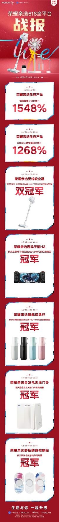 6月18日,榮耀智慧生活官微發(fā)文:榮耀親選生態(tài)產(chǎn)品6月1日-18日銷售額同比提升1548%,6月18日當(dāng)天銷售額同比提升1268%!吸塵器/游戲手柄/保溫杯/門鈴/按摩貼取得單品類銷量冠軍!