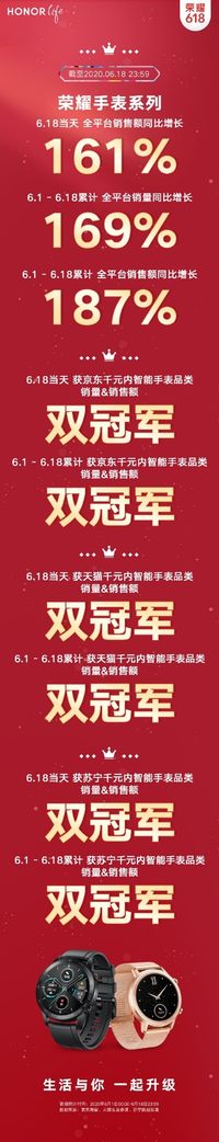 陳惺惺 · 2020-06-19 10:29 - 榮耀618戰(zhàn)報(bào):榮耀手表6.18當(dāng)天全平臺(tái)狂攬6項(xiàng)冠軍