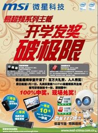 ??? (一)微星P43/P45易超頻系列主板開(kāi)學(xué)發(fā)獎(jiǎng)破極限! ??? 作為全球著名的主板廠家微星,從2009年3月1日到2009年3月31日,在全國(guó)范圍舉辦“微星P43/P45易超頻系列主板刮刮卡,百分百中獎(jiǎng)的活動(dòng)”。本次活動(dòng)微星總共準(zhǔn)備了價(jià)值百萬(wàn)的禮品,人人有獎(jiǎng)! ??? 在活動(dòng)期間,購(gòu)買(mǎi)任何微星科技的參加活動(dòng)的主板,均能獲得刮刮卡一張,即刮即得,百分百中獎(jiǎng)! ??? 此次活動(dòng)的